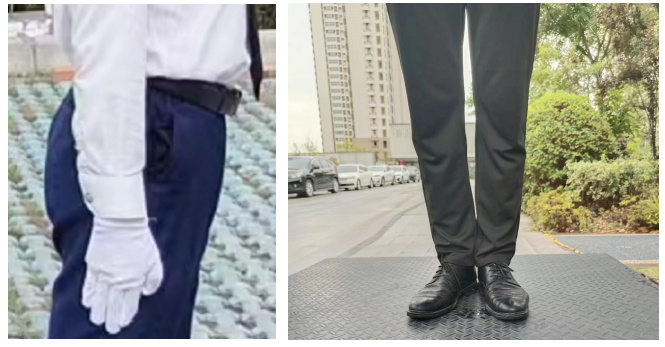 聽到“跨立”的口令后,左腳向左跨出約一腳之長,兩腿挺直,上體保持立正姿勢,身體重心落于兩腳之間。兩手后背,左手握右手腕,拇指根部與外腰帶下沿(內腰帶上沿)同高;右手手指并攏自然彎曲,手心向后。