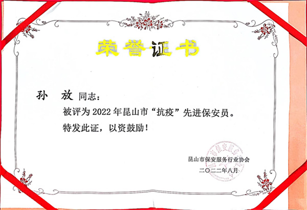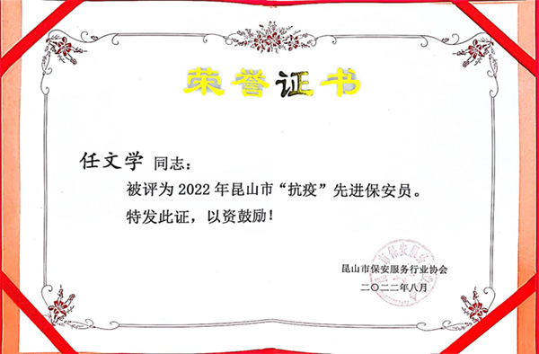 在此,也恭喜我司任文學及孫放同志榮獲“2022年昆山市抗疫先進保安員”稱號。