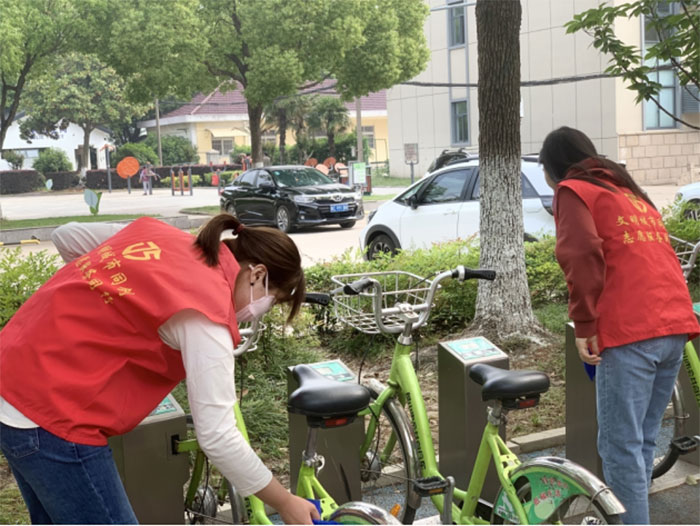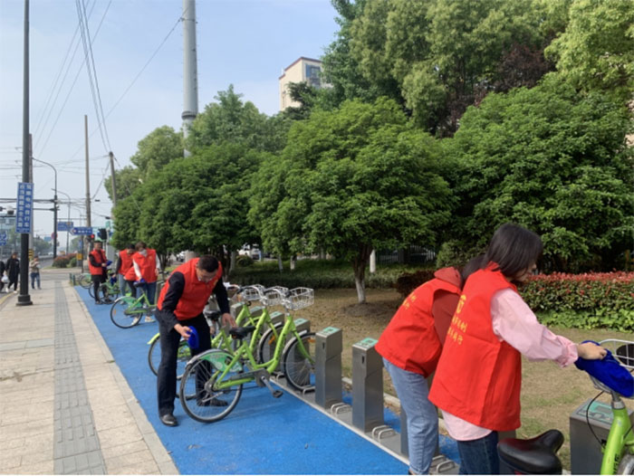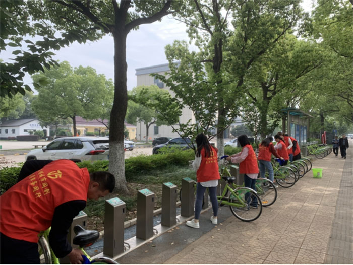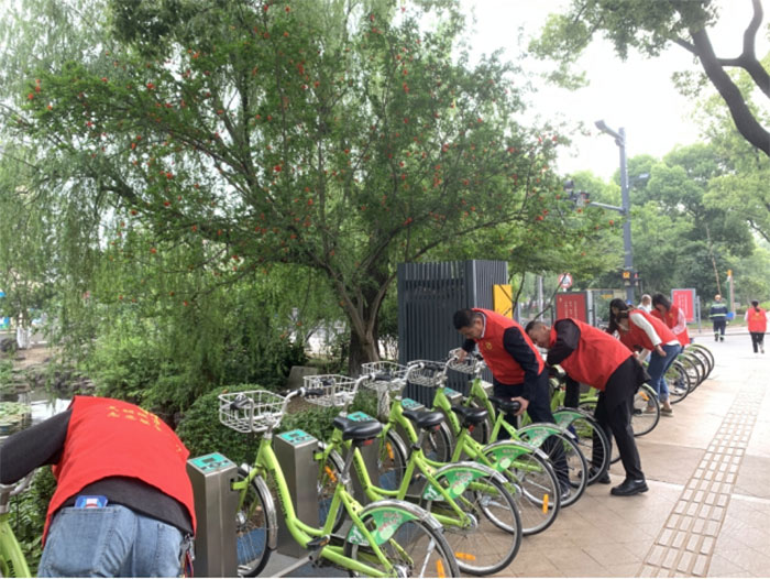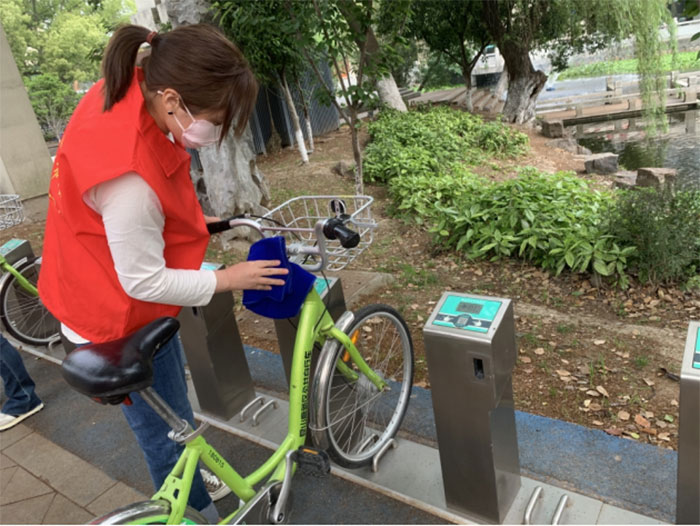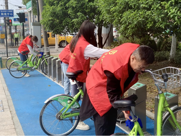 我們首先把共享單車擺放整齊,然后用抹布把單車擦拭干凈,完成之后我們繼續沿路行進,每經過一個單車停車點,我們都會把共享單車整齊規整的擺放在車位上,每輛單車都被擦拭的干干凈凈,整齊劃一擺放好,讓共享單車更美觀、使用時更便捷。