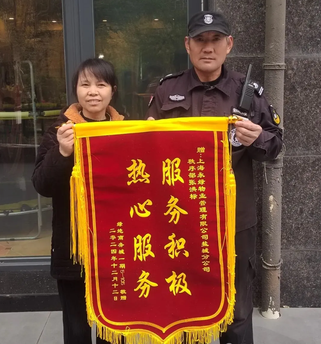 近日,我司駐鹽城永綠項目,一期五棟上演了溫馨一幕,保安員張洪標收獲了來自5棟-105業主的致謝錦旗。